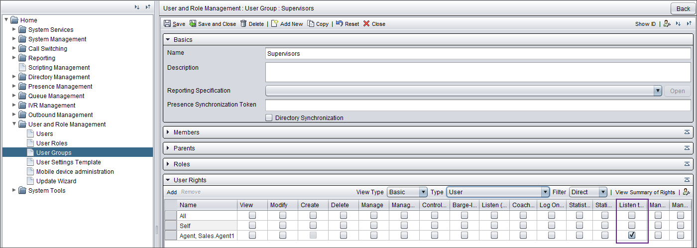 We recommend assigning the listening right to a user group or user role rather than to individual users.