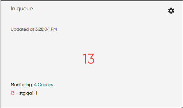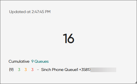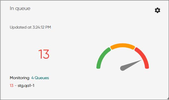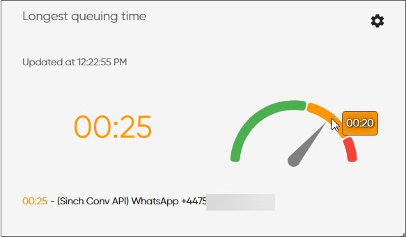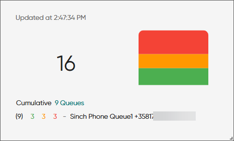 Card with a single queue: The gauge, bar, or numeric increases based on the conversation with the longest queuing time in the queue, progressing through the green stage (acceptable queuing time) yellow stage (warning level queuing time) then red (critical level queuing) until the answered-on-time limit is met or exceeded.