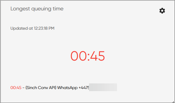 This card shows the progress of a conversation that has the longest queuing time. (Visual alerts require the queuing time threshold values and answered-on-time limit to be set in SC.)