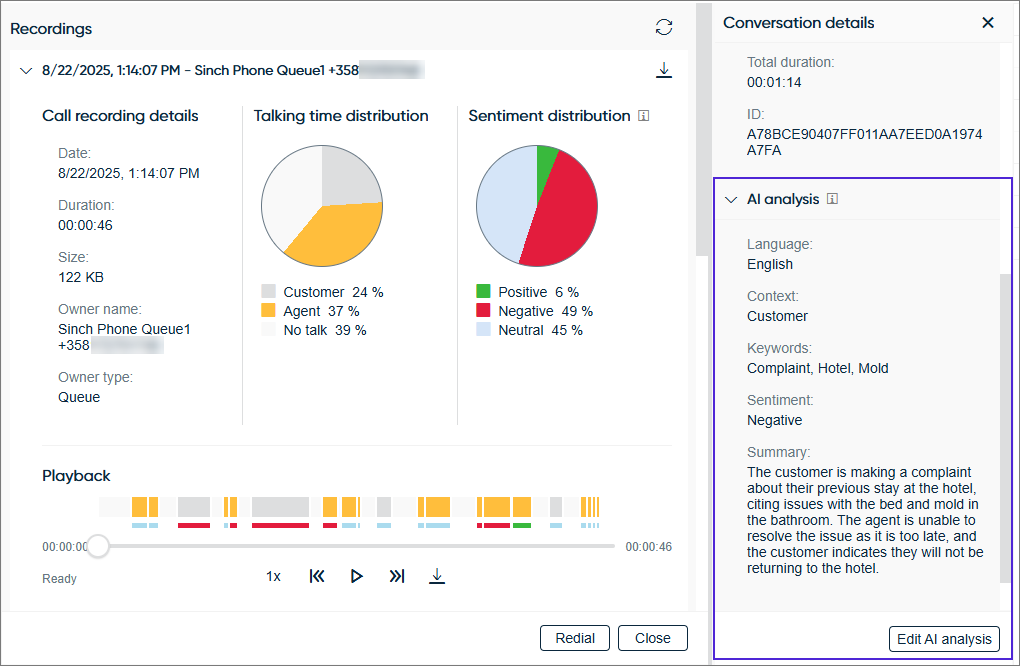 The AI analysis shows you the following in Communication Panel's Conversation details extension: