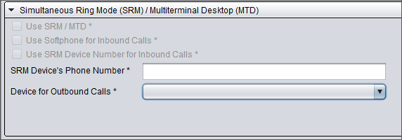 Choose which device is used for making outbound calls. For Simultaneous Ring Mode in Communication Panel, choose SRM Device's Phone Number from the dropdown so the Simultaneous Ring Mode device is used or to disable the setting and use the audio device of Communication Panel, choose the empty value.