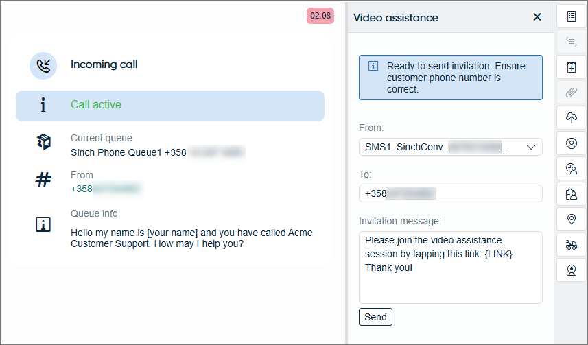 The agent can invite the customer to share video in a phone call by sending an SMS invitation from the Video assistance extension.