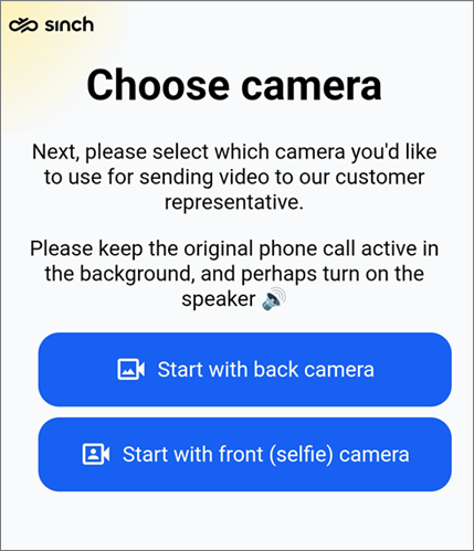 The customer receives the message and needs to tap the link to proceed. They'll be able to select the camera they want to use (back/front):