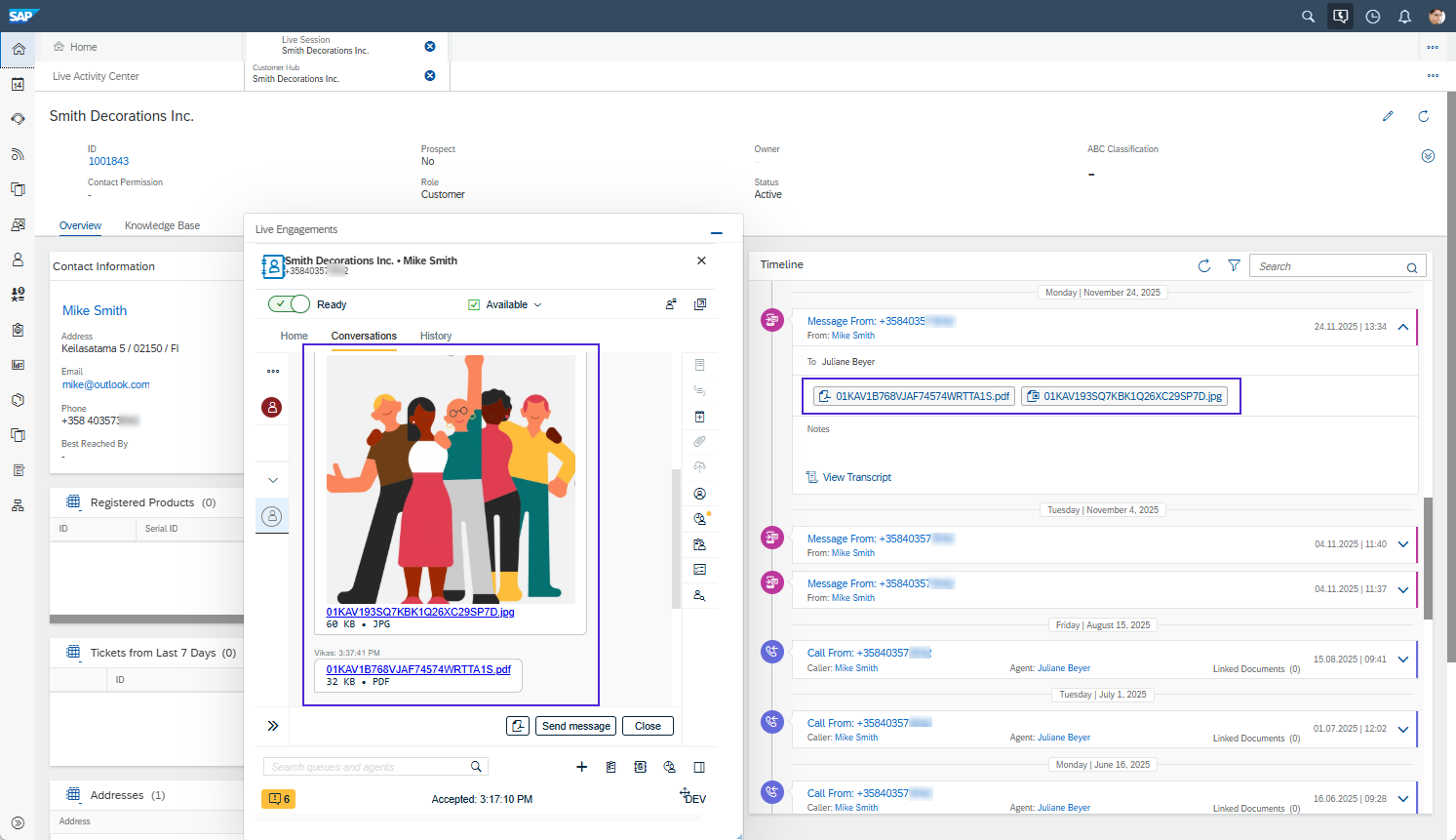 You can now configure chat attachments to be uploaded to SAP Service Cloud (C4C). After the chat ends, attachments are automatically uploaded to C4C and shown on the Customer Hub Timeline. Note that upload is not supported in SAP Service Cloud Version 2.