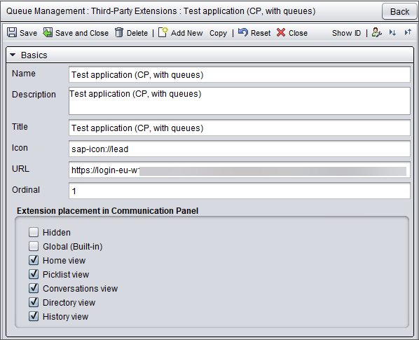 You now have a possibility to place your custom extension area in any of the main CP views: Home, Picklist, History, and Directory. Define the view(s) where the extension area is available in . Your configuration makes the third-party extension accessible to agents in CP via the extension area icon.
