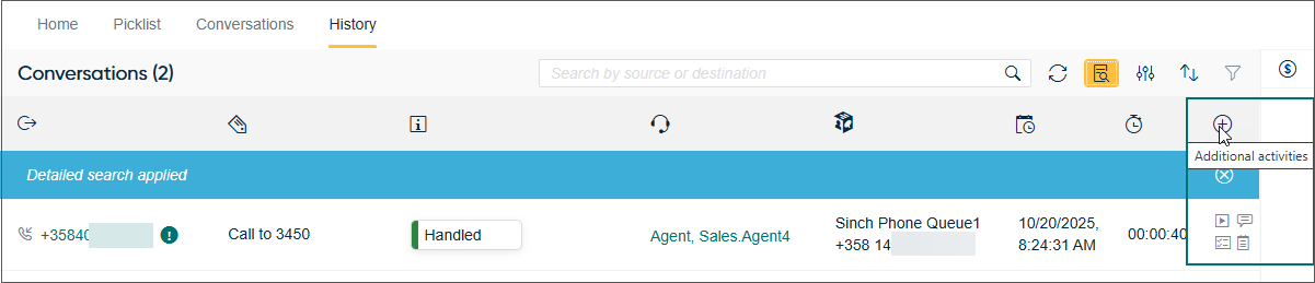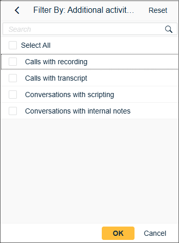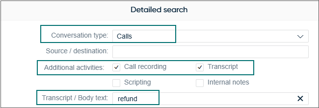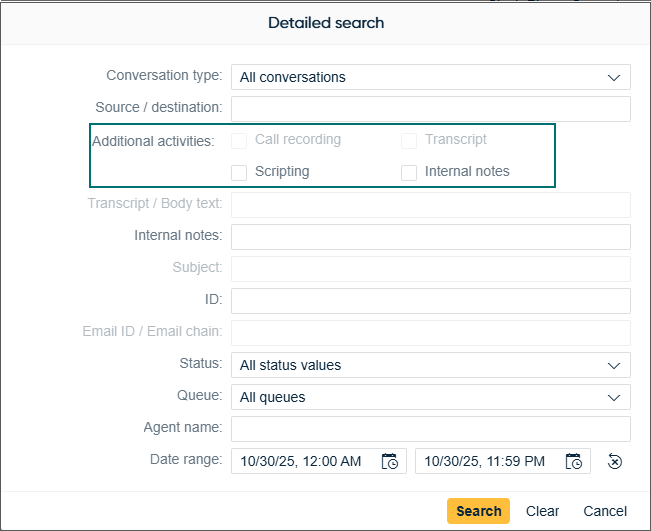 The Additional activities option in a detailed search now allows users to find conversations that contain transcripts or internal notes, in addition to the existing recordings and scripting options.