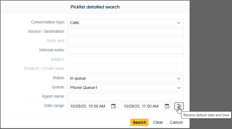 A new button in the History and Picklist views lets users restore the date and time to their default values.