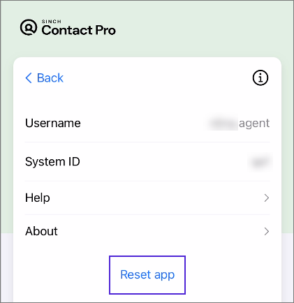 To revert the app to its original state, reset the app by tapping Reset and confirm. This will clear the app data and your user credentials. You'll then need to reconnect with your QR code. Your app language and permissions given will not change in a reset.