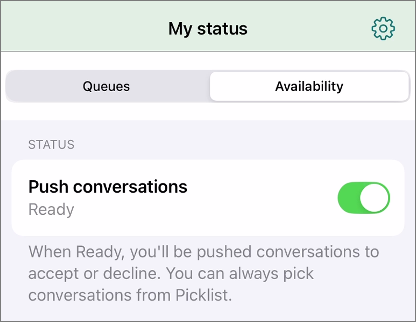If you want to be offered conversations automatically, set your status as Ready. You can always pick conversations from Picklist despite your status. If you're also using Communication Panel, your status keeps in sync between it and the mobile app.
